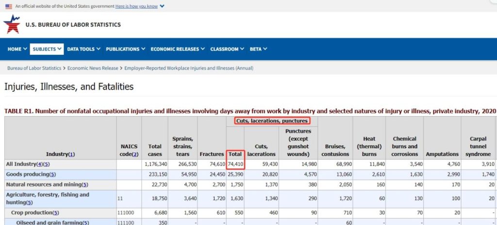 La Oficina de Estadísticas Laborales informa que cada año durante el período 2011-2020 hubo Más de 74,400 casos de cortes, laceraciones o punciones. que provocó días de ausencia del trabajo por parte de la industria privada [ 1 ].