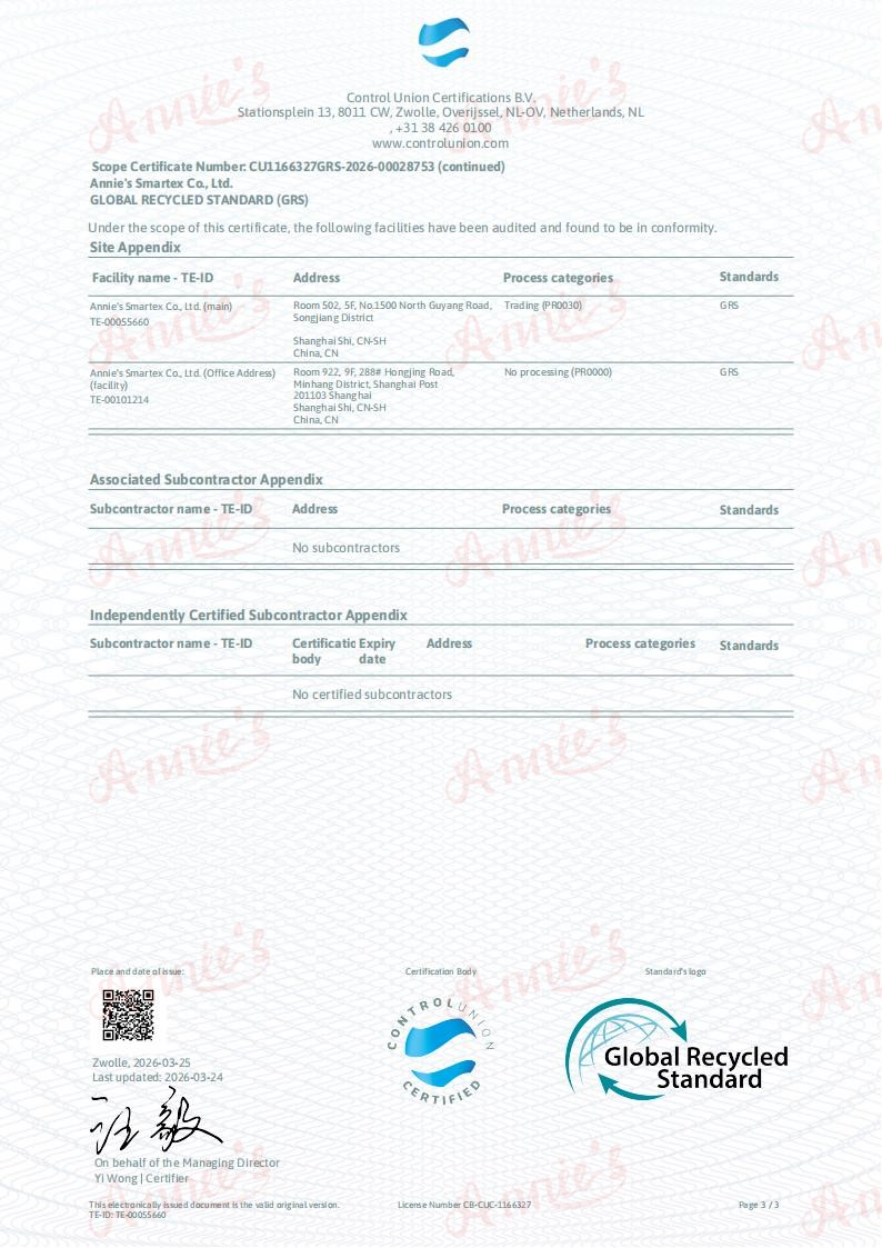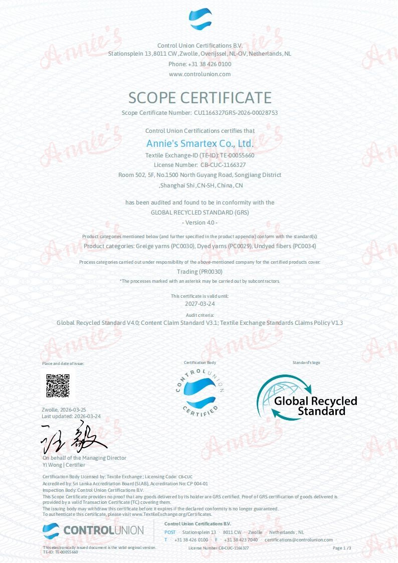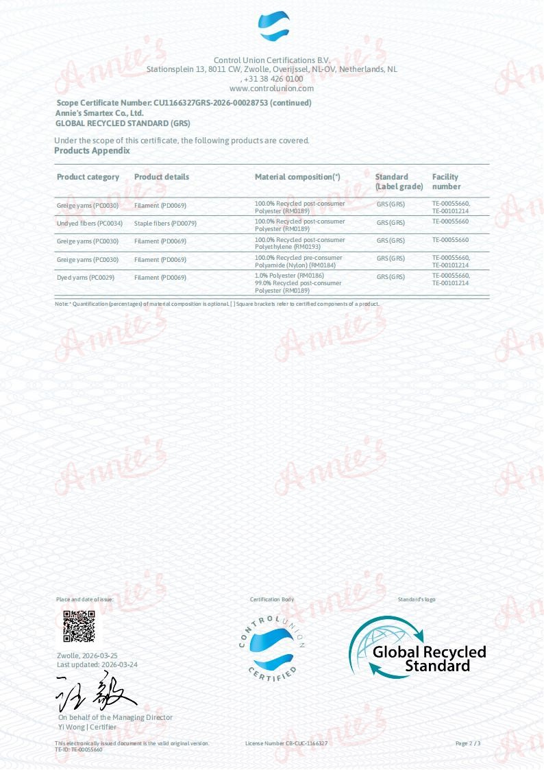 La certificazione, valida fino a dicembre 2025, copre la nostra gamma completa di filati e filati a filamento di poliestere, poliammide e polietilene nelle varianti bianco grezzo e bianco.